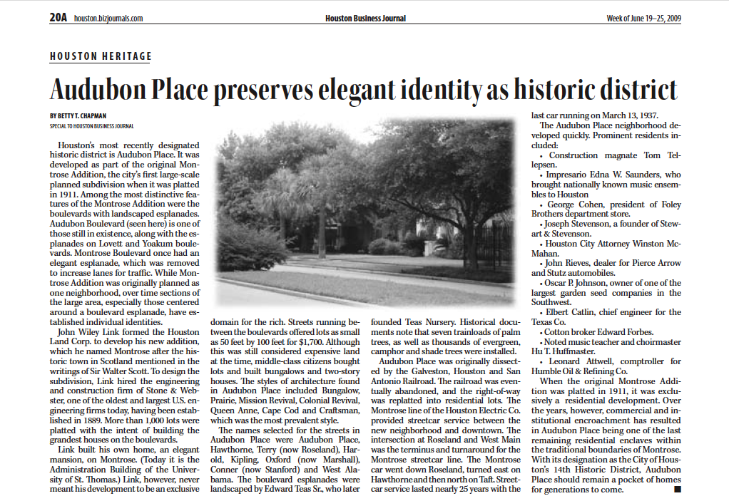 The Deed Restrictions for Audubon Place are held by Historic Montrose Association, Inc. a registered non profit corporation